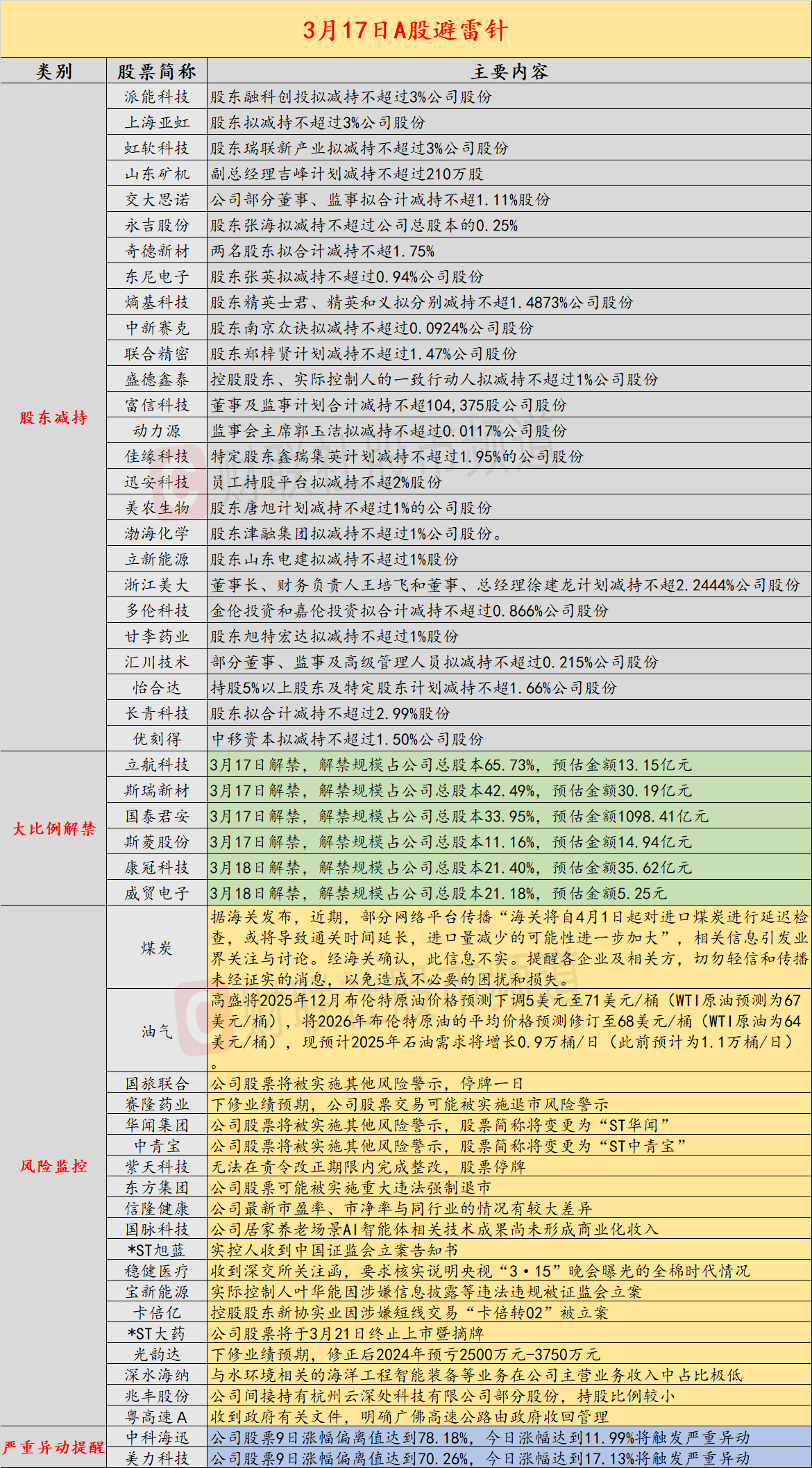导读:财联社3月17日投资避雷针,近日,A股及海外市场潜在风险事件如下。国内经济信息方面包括:1)证监会、公安、网信等多部门联手,以“零容忍”态度严厉打击股市“小作文”;2)海关发布澄清,“海关将对进口煤炭实施延迟检查”为不实信息;公司方面重点关注包括:1)赛隆药业下修业绩预期,公司股票交易可能被实施退市风险警示;2)中青宝公司股票将被实施其他风险警示,股票简称将变更为“ST中青宝”;海外市场重点关注包括:1)高盛下调油价和原油需求增速预测;2)苹果Siri负责人称AI延迟“糟糕”并承诺修复。