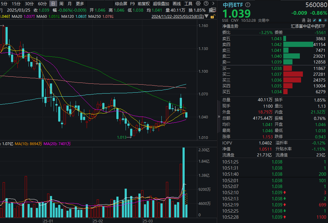 今日(3.25)A股冲高回落,中药ETF(560080)震荡回调近1%,昨日成交额超大幅放量!资金面上,昨日大幅净流入超1.3亿元,近20日更是“吸金”超2.7亿元!