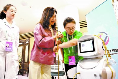 3月25日,2025中关村年会组织集体采访活动。这是在北京市三山五园文化艺术中心,非遗“何氏通络开结术”代表性传承人何银萍(中)向记者展示“智能AI罐疗仪”的使用方法。中国妇女报全媒体记者 杨睿/摄