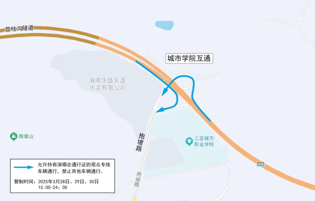 管制措施:除持有演唱会车辆通行证的观众专线车辆外,禁止其他车辆从G98高速城市学院互通下匝道进入抱坡路通行。