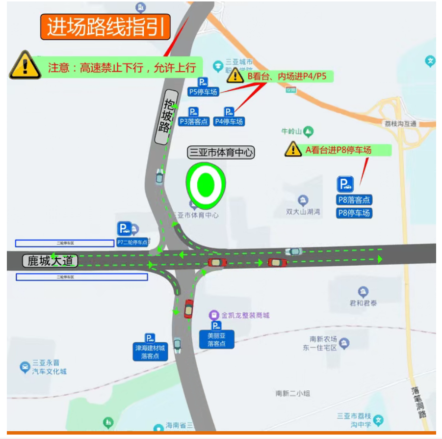 B看台和内场的观众,自驾可前往P4、P5停车场停车入场。