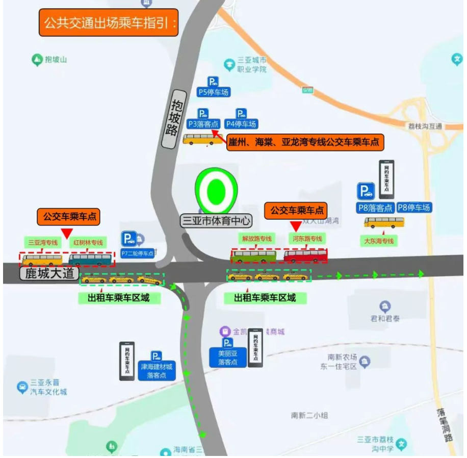 公交车乘车点:解放路、河东路、三亚湾、红树林专线公交可前往鹿城大道指定乘车区域乘车;大东海专线公交可前往P8停车场乘车,海棠、崖州、亚龙湾专线公交可前往P3停车场乘车。