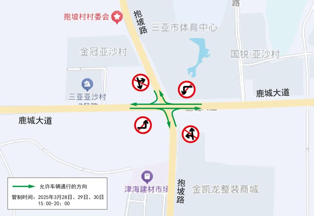 管制措施:沿抱坡路行驶的车辆通过路口只允许右转进入鹿城大道,禁止直行和左转;沿鹿城大道行驶车辆通过路口只允许直行或右转进入抱坡路,禁止左转。