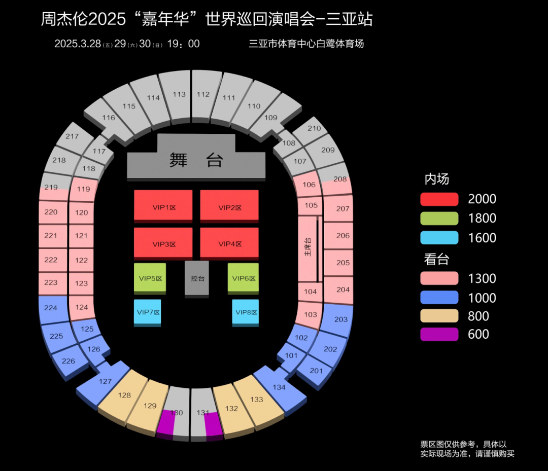 演出票价:内场2000元、1800元、1600元;看台1300元、1000元、800元、600元
