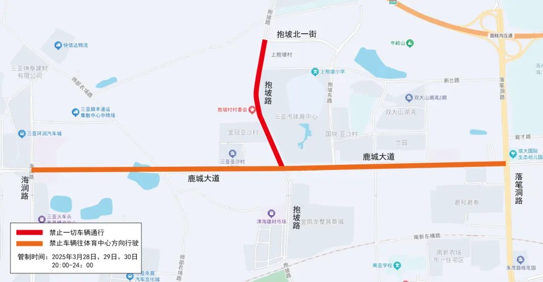 2025年3月28日、29日、30日13:00至24:00,抱坡路、落笔洞路、育新路、鹿城大道(落笔洞路路口至育新路路口),禁止所有货运车辆(含货运面包车)和危化品运输车辆通行。荔枝沟路、海润路禁止4.5吨(含)以上大型货运车辆、危化品运输车辆通行。