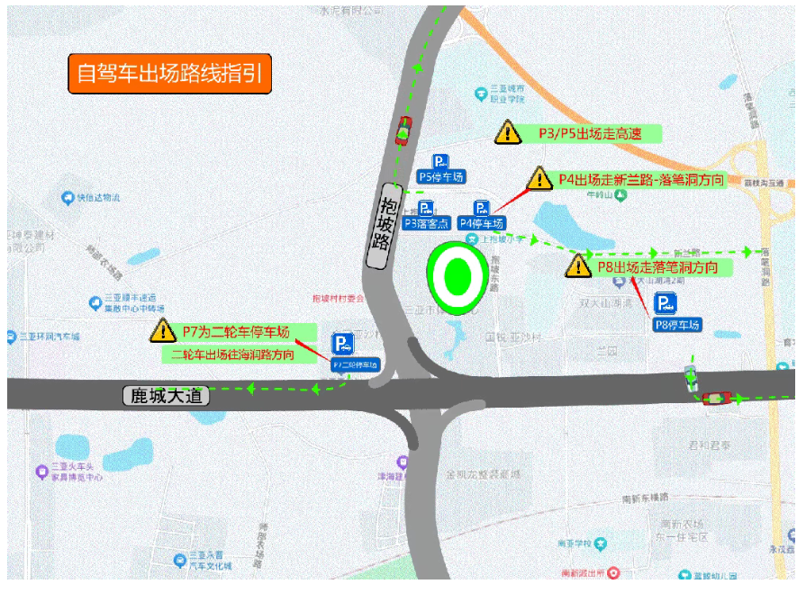 自驾的观众请注意:从P3、P5停车场出场的车辆需要往高速路口行驶走高速公路离开;从P4停车场出场的车辆,需要往新兰路—落笔洞方向行驶离开;从P8停车场出场的车辆需要往落笔洞方向行驶离开;从P7停车场出场的车辆需要往海润路方向行驶离开。