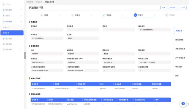 加注过程中,加注船上安装的质量流量计实时读取燃料密度、加油量等加注数据,并同步推送至国际航运数字船供服务平台及海关、海事系统,形成动态监管链路。