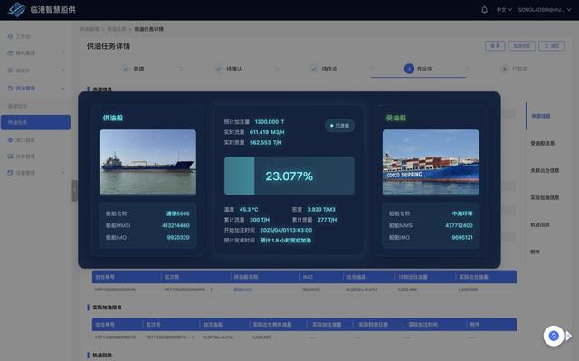 4月1日上午,“中海环球”(CSCL GLOBE)轮在临港新片区国际航运数字船供服务平台发起加油需求,中国船舶燃料有限责任公司(以下简称“中国船燃”)依托平台智慧船供模块完成供需匹配及电子签约,并向海关、海事部门同步提交材料完成无纸化申报审批。