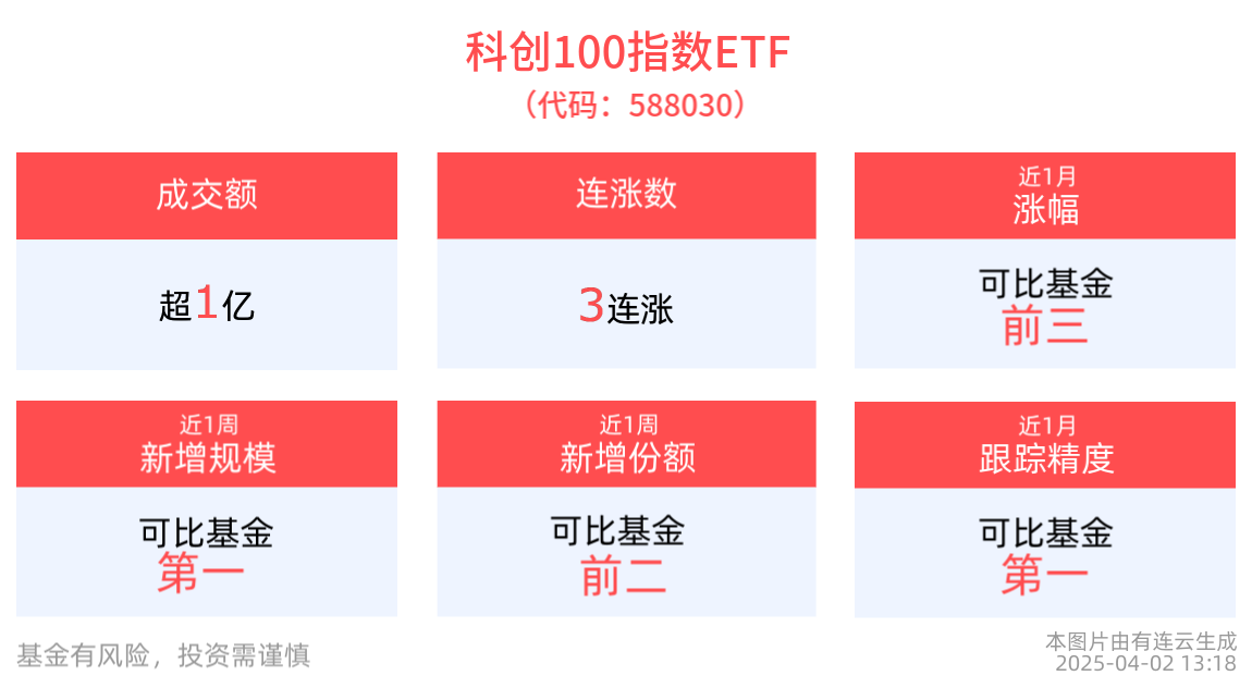 跟踪精度方面,截至2025年4月1日,科创100指数ETF近1月跟踪误差为0.012%,在可比基金中跟踪精度最高。