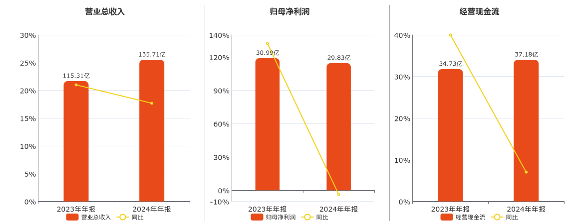 公司营业总收入为135.71亿元,较去年同报告期营业总收入增加20.39亿元,实现4年连续上涨,同比较去年同期上涨17.68%。归母净利润为29.83亿元,较去年同报告期归母净利润减少1.17亿元,同比较去年同期下降3.76%。经营活动现金净流入为37.18亿元,较去年同报告期经营活动现金净流入增加2.45亿元,实现4年连续上涨,同比较去年同期上涨7.04%。