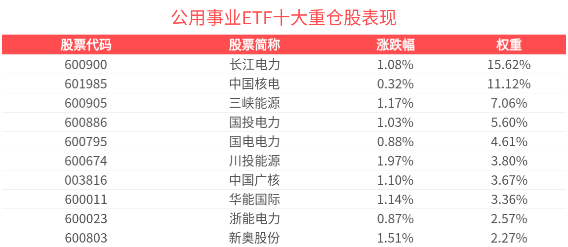 公用事业ETF紧密跟踪中证全指公用事业指数,中证全指行业优选指数系列从中证全指行业中选取符合一定流动性与市值筛选条件的上市公司作为指数样本,以反映各个行业内较具代表性与可投资性的上市公司证券的整体表现。数据显示,截至2025年3月31日,中证全指公用事业指数前十大权重股分别为长江电力、中国核电、三峡能源、国电电力、国投电力、川投能源、华能国际、中国广核、浙能电力、华电国际,前十大权重股合计占比57.95%。
