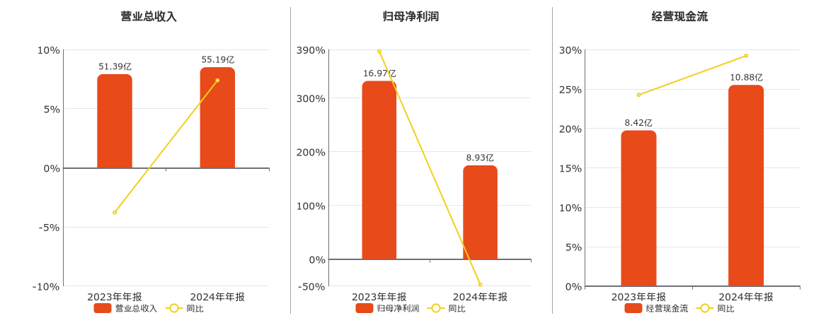 公司营业总收入为55.19亿元,较去年同报告期营业总收入增加3.80亿元,同比较去年同期上涨7.39%。归母净利润为8.93亿元,较去年同报告期归母净利润减少8.04亿元,同比较去年同期下降47.37%。经营活动现金净流入为10.88亿元,较去年同报告期经营活动现金净流入增加2.46亿元,实现2年连续上涨,同比较去年同期上涨29.20%。