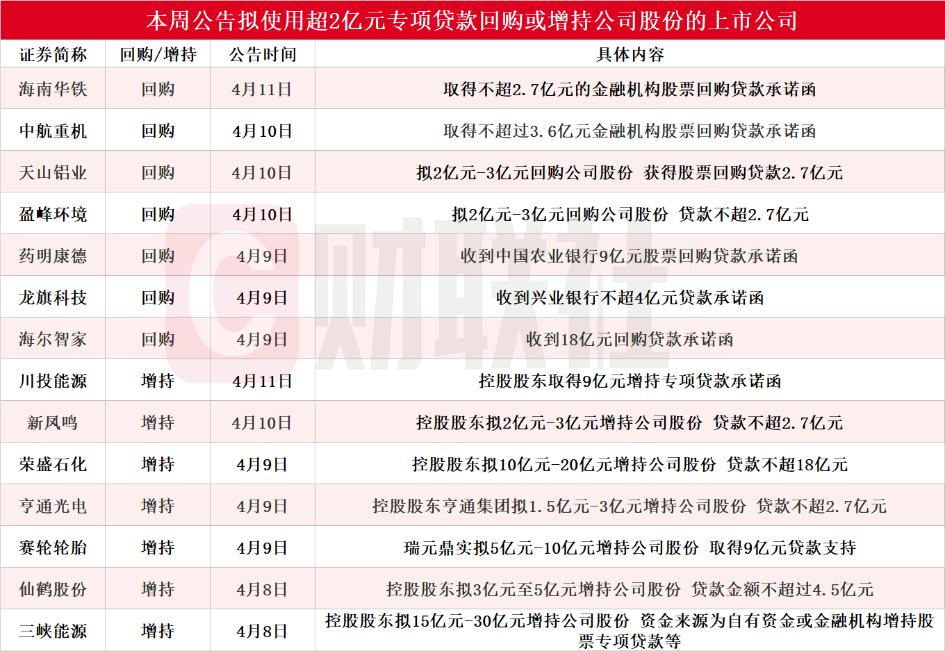 财联社4月13日讯(编辑 若宇)近期A股市场掀起新一轮增持回购潮,其中不乏公司披露回购增持再贷款相关情况。据财联社不完全统计,截至发稿,本周(4月7日-4月13日)包括海南华铁、中航重机、天山铝业、盈峰环境、药明康德、龙旗科技、海尔智家、川投能源、新凤鸣、荣盛石化、亨通光电、赛轮轮胎、仙鹤股份、三峡能源在内的14家上市公司披露拟使用超2亿元专项贷款回购或增持公司股份。具体情况如下图: