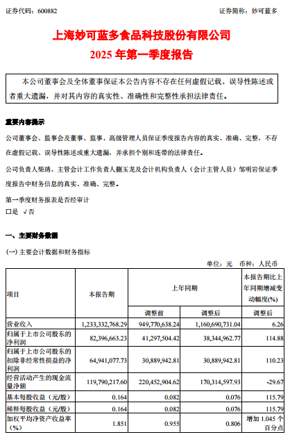 【环球网消费综合报道】4月22日,妙可蓝多发布了2025年第一季度财务报告。数据显示,2025年第一季度,妙可蓝多实现营收12.33亿元,同比增长6.26%。在净利润方面,实现归母净利润8239.67万元,同比大增114.88%。