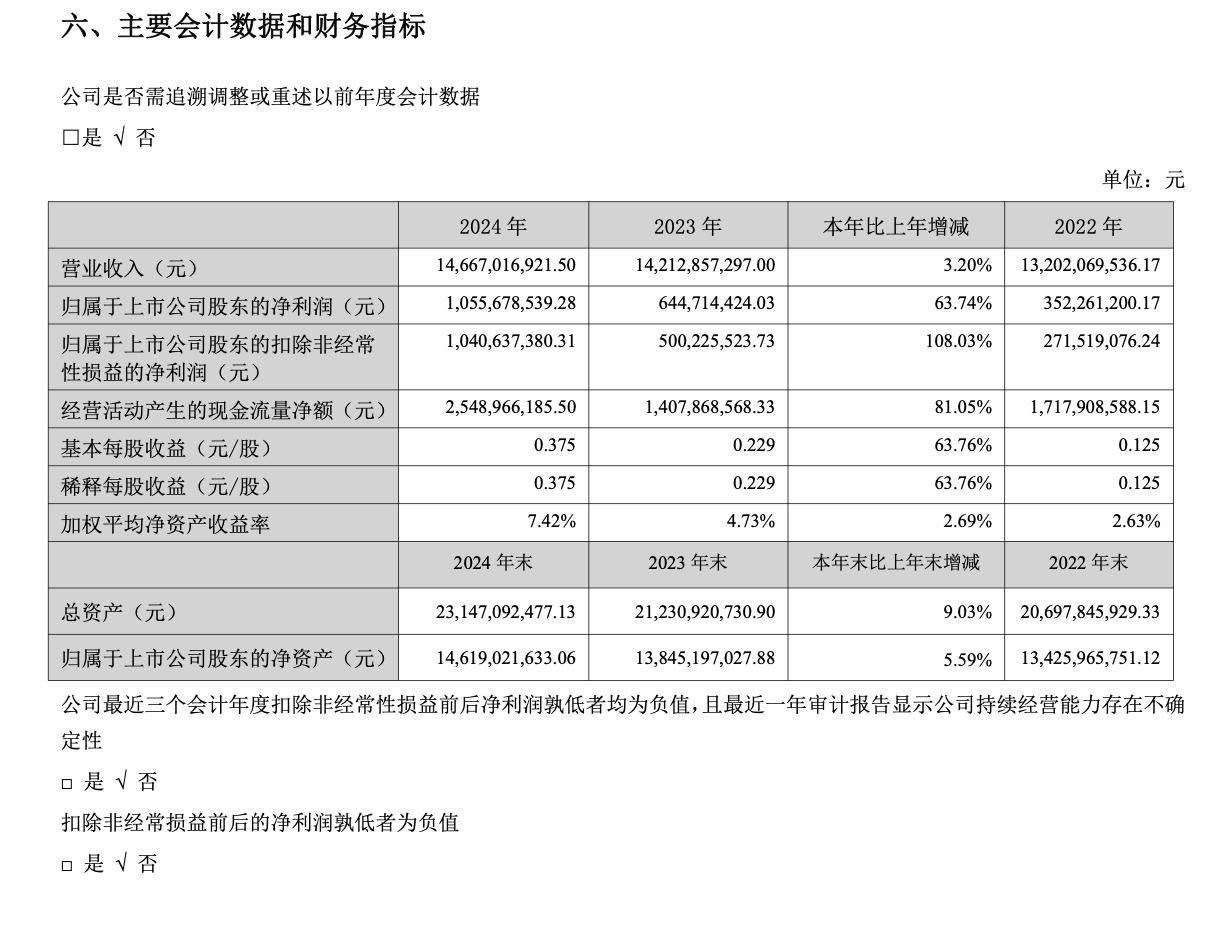 财报数据显示,2024年燕京啤酒实现营业收入146.67亿元,同比提升3.2%;归属于上市公司股东的净利润为10.56亿元,同比提升63.74%;实现啤酒销量400.44万千升,同比增长1.57%。