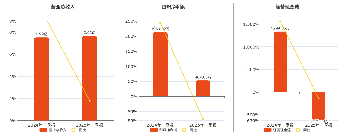 公司营业总收入为2.02亿元。归母净利润为487.05万元,较去年同报告期归母净利润减少1475.97万元,同比较去年同期下降75.19%。经营活动现金净流入为-2475.14万元,较去年同报告期经营活动现金净流入减少7774.69万元,同比较去年同期下降146.70%。