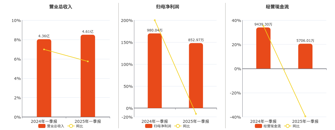 公司营业总收入为4.61亿元。归母净利润为852.97万元,较去年同报告期归母净利润减少127.07万元,同比较去年同期下降12.97%。经营活动现金净流入为5706.01万元,较去年同报告期经营活动现金净流入减少3733.28万元,同比较去年同期下降39.55%。