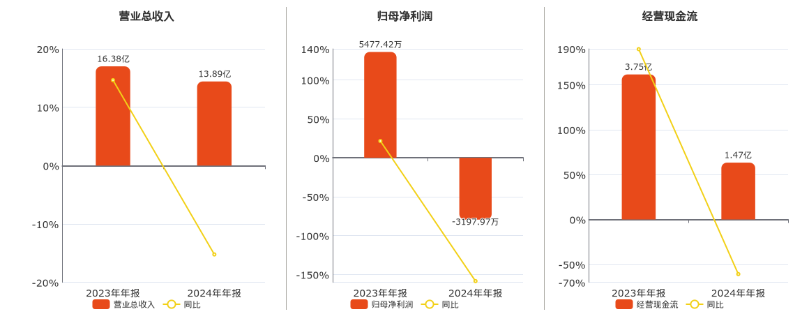 公司营业总收入为13.89亿元,在已披露的同业公司中排名第81,较去年同报告期营业总收入减少2.49亿元,同比较去年同期下降15.22%。归母净利润为-3197.97万元,在已披露的同业公司中排名第127,较去年同报告期归母净利润减少8675.39万元,同比较去年同期下降158.38%。经营活动现金净流入为1.47亿元,在已披露的同业公司中排名第68,较去年同报告期经营活动现金净流入减少2.28亿元,同比较去年同期下降60.81%。