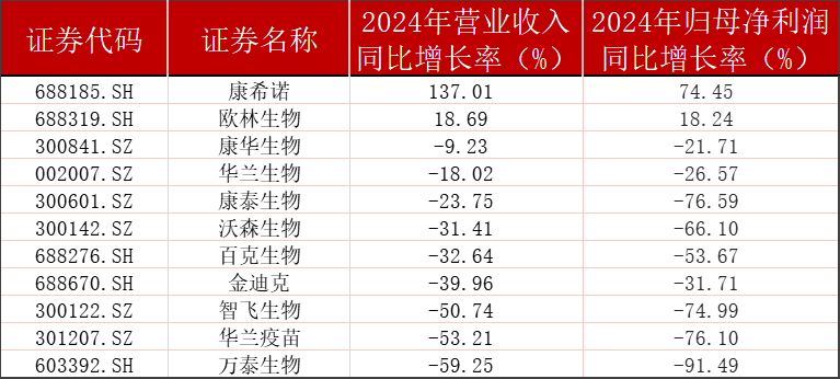 9家A股疫苗企业中,康希诺(688185.SH)、欧林生物(688319.SH)2024年的营收净利同比双增。但康希诺的归母净利润仍处于亏损状态。康希诺年报显示,剔除去年新冠疫苗预估退货影响后,公司2024年营业收入同比增长38.68%,曼海欣®作为中国市场上唯一的四价流脑结合疫苗,实现销量快速增长。