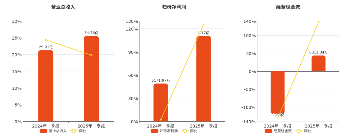公司营业总收入为34.76亿元。归母净利润为1.17亿元。经营活动现金净流入为6811.34万元。