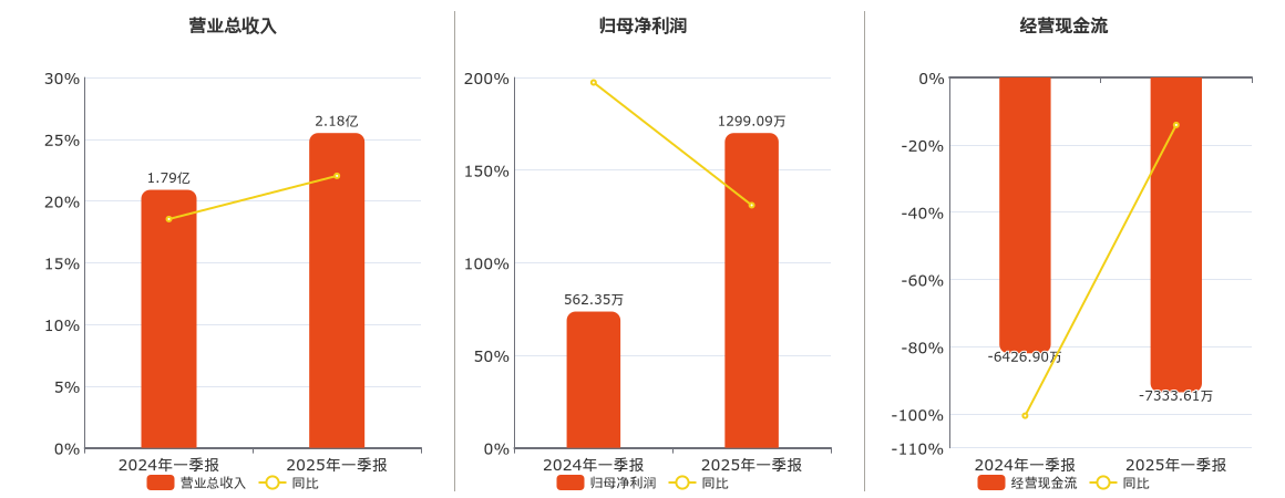 公司营业总收入为2.18亿元。归母净利润为1299.09万元。经营活动现金净流入为-7333.61万元,较去年同报告期经营活动现金净流入减少906.71万元。