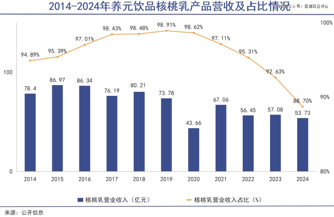 养元饮品身处市场规模近乎无限大的饮料市场,真正的症结不在于行业不行了,而在于产品单一。长期以来,核桃乳产品几乎以一己之力支撑着养元饮品的发展,新爆款迟迟无法出现。