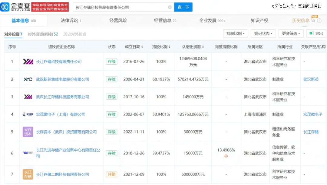 其中,最有影响力的莫过于全资持有的长江存储科技有限责任公司(下称“长江存储”)、控股68.19%的武汉新芯集成电路股份有限公司(以下简称“新芯股份”),以及控股50.94%的宏茂微电子(上海)有限公司(以下简称“宏茂微”)。