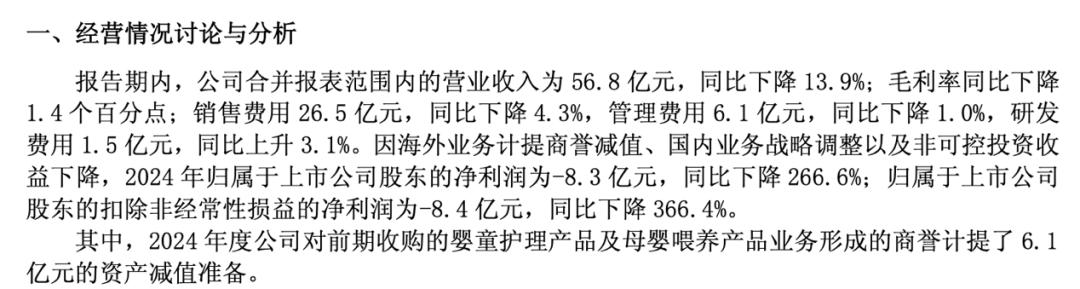 对于业绩大幅亏损的原因,上海家化表示,公司对前期收购的婴童护理产品及母婴喂养产品业务形成的商誉资产进行减值测试,并计提了减值准备。