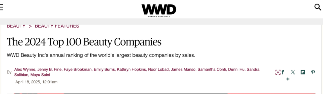 此外,Women's Wear Daily近期公布了美妆界一年一度“大事记”——2024年度全球美妆企业百强名单(按销售额排名)。可以看出,在国内市场表现亮眼的中国美妆公司也开始在国际舞台崭露头角。