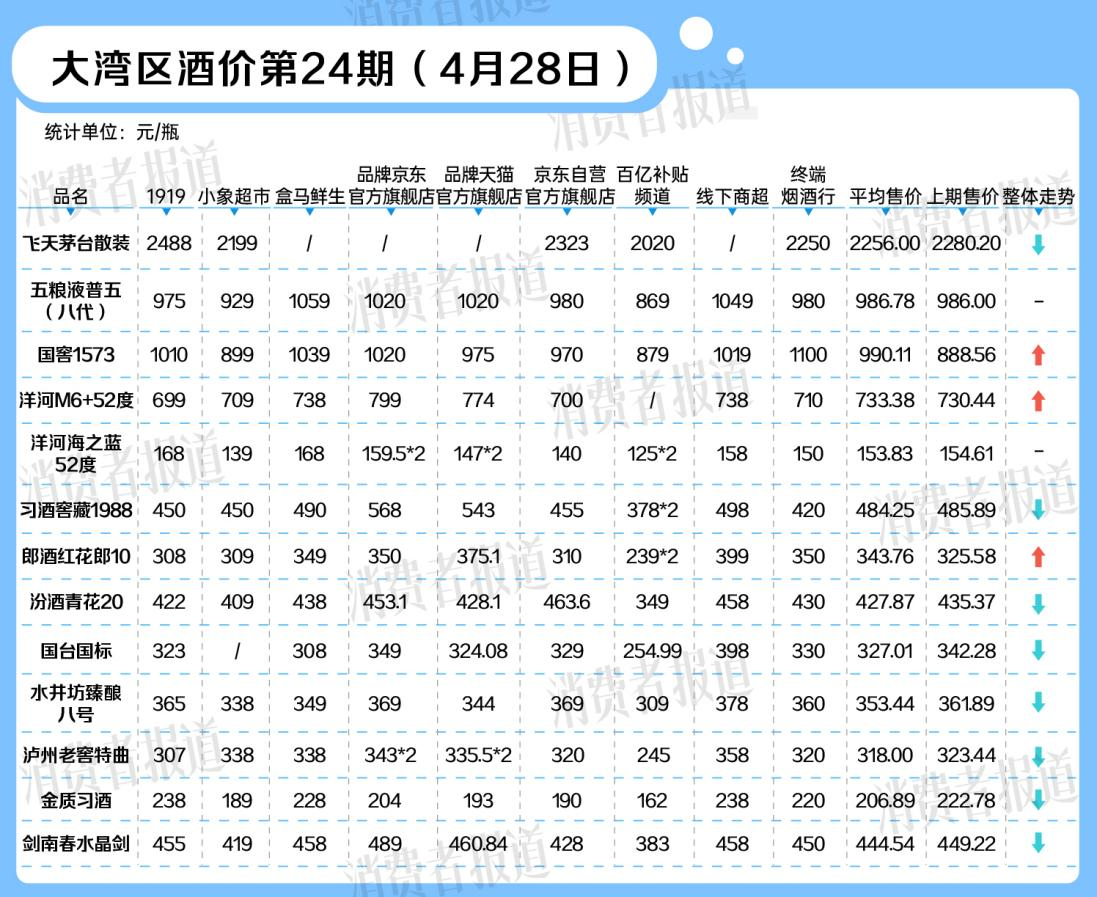 随着天气升温,白酒市场逐渐步入传统消费淡季。除国窖1573以外,多款白酒价格对比上期有所下降。