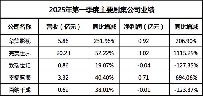 完美世界同样成功扭亏为盈,2025年Q1营收20.23亿元,同比增长52.22%;净利3.02亿元,而去年全年亏损达12.88亿。虽然这波盈利主要得益于《诛仙世界》端游及电竞产品带动的游戏收入增长,但仅从影视业务来看,完美也凭借报告期内多部剧集作品的播出并确认收入,贡献了5.96亿的营收,较上年同期增加1616.29%。