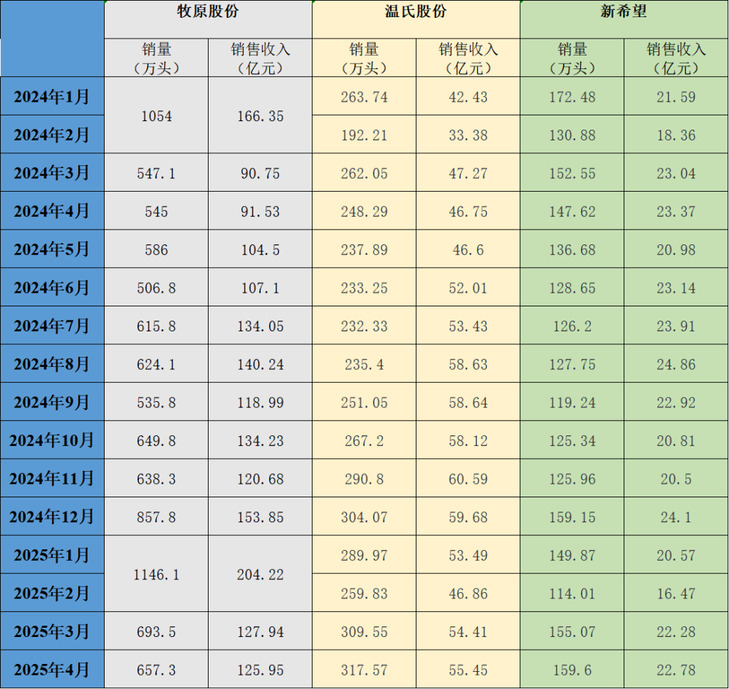 三大上市猪企牧原股份(002714.SZ)、新希望(000876.SZ)、温氏股份(300498.SZ)近日发布2025年4月生猪销售情况简报。