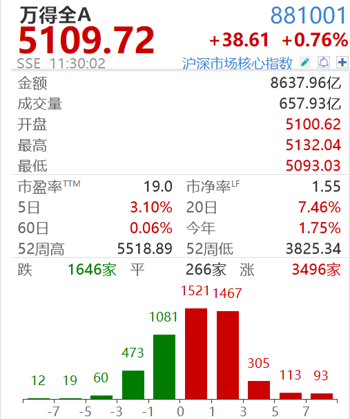 全市场半日成交额为8637.96亿元,较上日略有放量;全市场3496只个股上涨,1646只个股下跌。