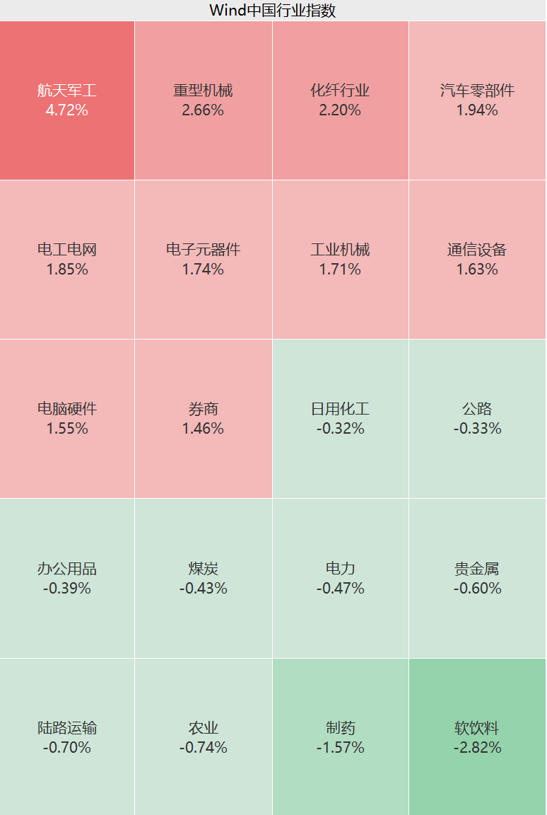 行业板块方面,上午国防军工板块引爆市场,中船系、中航系、航母、军工信息化等概念股涨幅居前;电力设备、机械设备、非银金融等板块亦有较好表现。医药生物板块不振,农业、贵金属、软饮等行业走低。