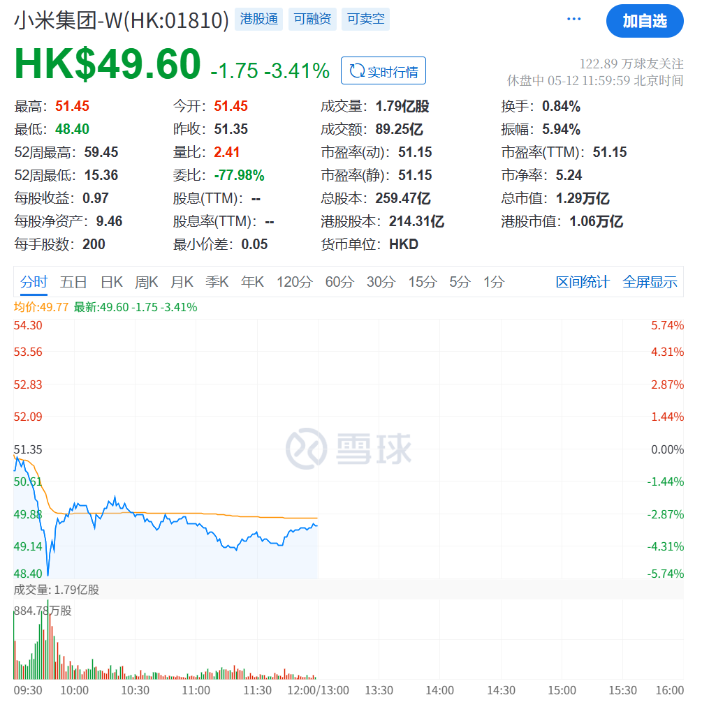 5月12日上午,港股小米集团盘中跳水,股价最低跌至48.4港元/股,跌近6%。截至午间收盘,小米集团股价报49.6港元/股,跌幅为3.41%。