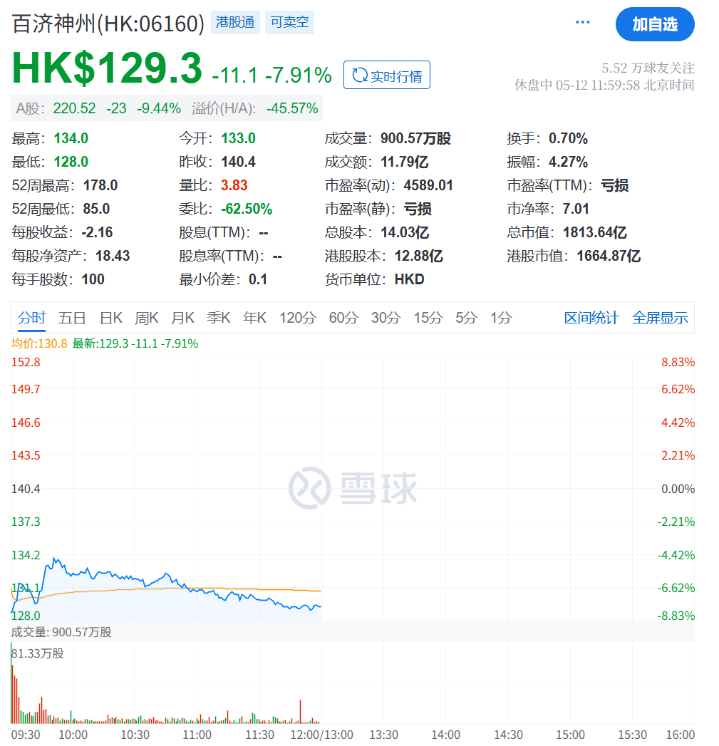 5月12日上午,医药生物板块不振,仿制药、创新药等概念股跌幅居前。截至午间收盘,百济神州A股跌超9%,港股跌近8%;泽璟制药、舒泰神、百利天恒、科华生物、迪哲医药、信立泰、恒瑞医药等多股大跌。