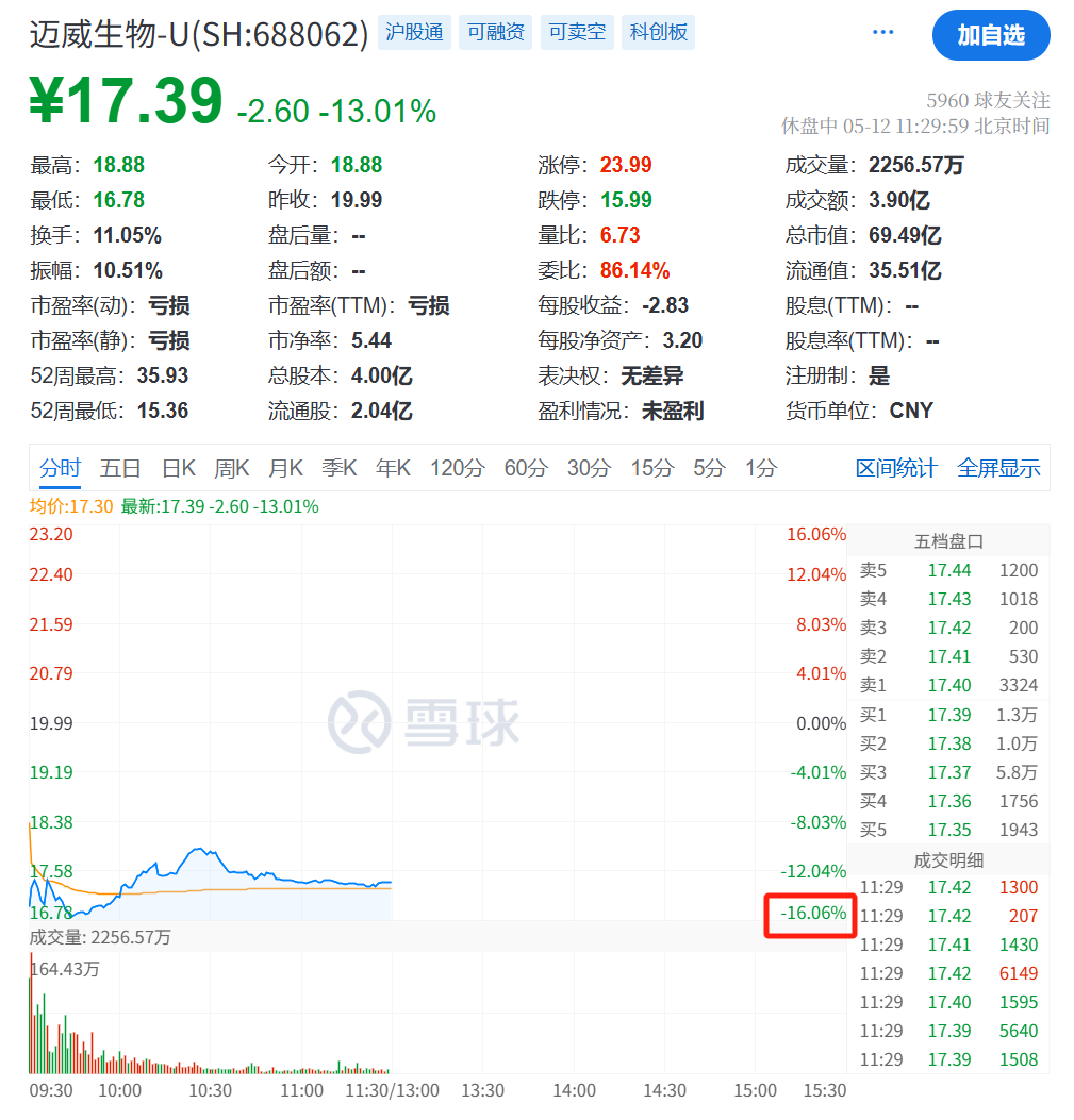 迈威生物开盘大跌,盘中跌超16%,股价最低跌至16.78元/股。截至午间收盘,迈威生物跌超13%。