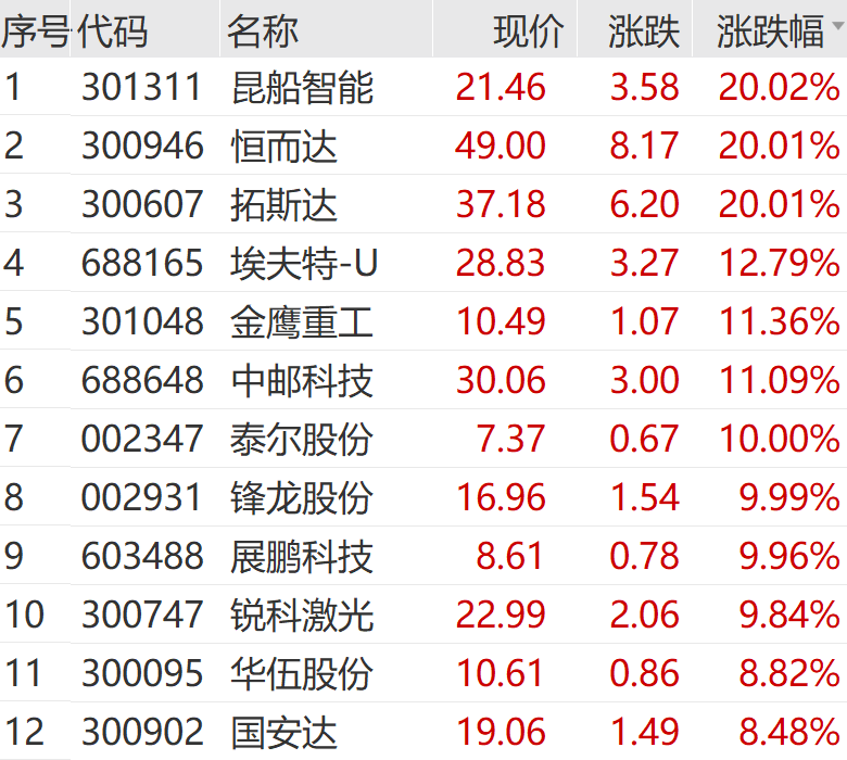 此外,上午电力设备、机械设备等板块均有较好表现,昆船智能、恒而达、拓斯达等个股走出20CM涨停。