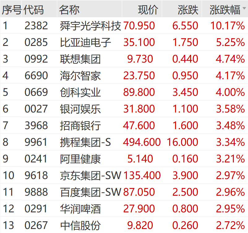 舜宇光学科技涨超10%,领涨恒生指数成份股。