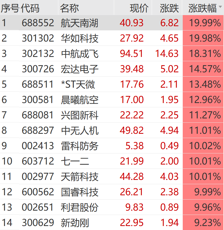 5月12日上午,A股国防军工板块持续走强。截至午间收盘,航天南湖、华如科技保持20CM涨停状态,雷科防务、七一二、天箭科技等多股涨停。