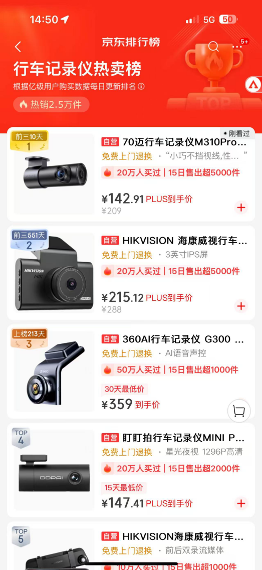 (注:榜单数据来源京东5月行车记录仪热卖榜单,具体排名以京东实时更新为准)行车记录仪这玩意儿,关键时刻能保命还能甩锅!京东基于每日更新的亿级用户购买数据,综合销量、人气、口碑、品牌力等多维度,会评选出的行车记录仪热卖榜数据。不仅更权威,也能真实反映市场偏好与产品实力。在2025年5月榜单中,70迈、海康威视、360、盯盯拍四大品牌强势霸榜,高清夜视、智能交互等功能全面下放至入门价位,行业竞争已从“参数内卷”转向“场景适配”。以下就是本次热卖榜TOP5机型的深度解析,闭眼入不踩坑!
