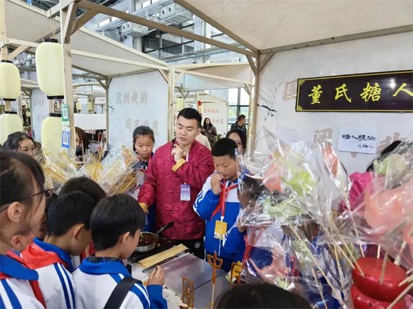 糖画摊位前,孩子们在师傅帮助下绘制生肖等造型,现场飘满甜蜜香气。