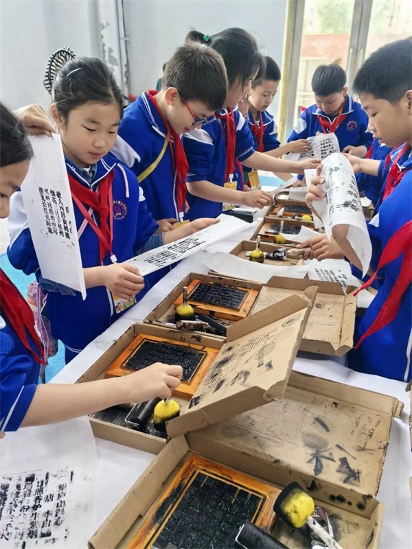 在活字印刷体验区,孩子们化身“小小印刷匠”,手持棕刷反复练习“蘸墨-刷版-拓印”的古老工艺,沉浸在活字印刷的奇妙课堂。