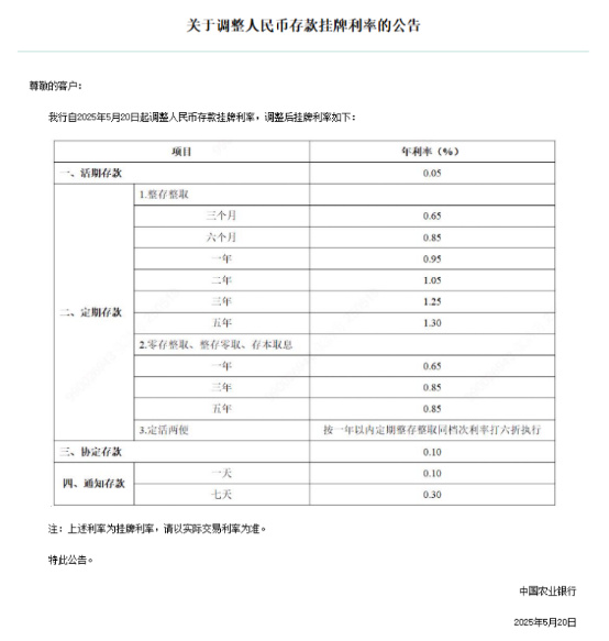 具体来看,中国银行、农业银行、中国工商银行、建设银行活期利率下调5个基点至0.05%;定期整存整取三个月期、半年期、一年期、二年期均下调15个基点,分别为0.65%、0.85%、0.95%、1.05%;三年期和五年期均下调25个基点,分别至1.25%和1.3%。7天期通知存款利率下调15个基点至0.3%。