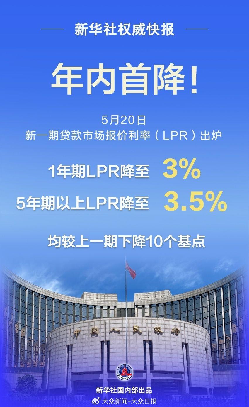 5月20日,新一期贷款市场报价利率(LPR)出炉,1年期和5年期以上LPR双双下降10个基点,1年期LPR降至3%,5年期以上LPR降至3.5%,这是LPR年内首降。