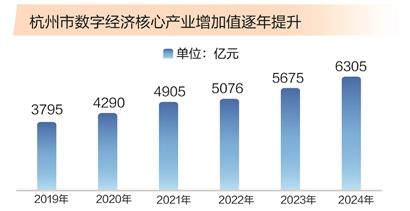 杭州以数字经济为核心驱动力,打造引领全国的经济增长新范式。2024年,杭州市数字经济核心产业增加值6305亿元,占GDP比重28.8%,占比较上一年提升0.5个百分点。