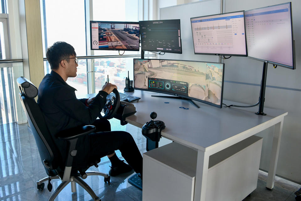 在日照港集装箱分公司的自动化远控中心,工作人员正通过多块拼接屏调度全场设备。屏幕上,每台无人集卡的实时位置、状态参数、任务队列一目了然。“以前的岸桥司机每天爬40米高的铁梯,在狭小操作室低头操作12小时,一天下来非常疲惫。”山东港口日照港集装箱分公司智慧控制中心副经理刘志鹏告诉记者。