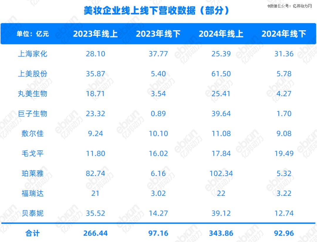 在美妆上市公司TOP15中,有9家企业披露了线上线下营收数据。亿邦动力统计显示,这9家企业线上渠道总营收达266.44亿元,同比增长29.06%。值得注意的是,这种线上化进程正在呈现出明显的分化特征。