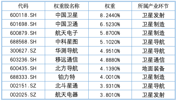 卫星产业ETF(159218)前十大权重股:中国卫星、中国卫通、航天电子、中科星图、华测导航、移远通信、北方导航、铂力特、北斗星通、航天电器