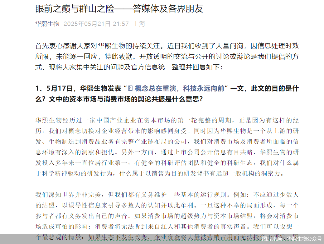 近期,备受市场关注的华熙生物在5月21日再度发文,就此前5月17日的发文内容做进一步解释,也再度提及券商研报内容。